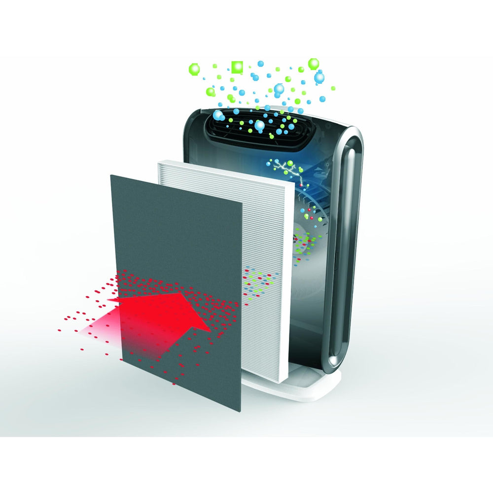 - Four-stage purification system captures 99.97% of airborne particles as small as 0.3 microns, including pollen and other allergens, dust mites, mould spores, pet dander and cigarette smoke - AeraSafe Antimicrobial Treatment – built-in protection from the growth of odour causing bacteria, mildew and fungi on True HEPA filter - AeraSmart Sensor monitors the air quality & automatically adjusts the fan speed to keep your air purified. Blue, amber and red lights indicate the purity of your air - Aera+ Mode is designed for peak allergy conditions & increases air flow by 50% to remove allergens from your air - Filter Change Indicators let you know when it is time to replace your Carbon and True HEPA filters - Recommended for rooms up to 28m²