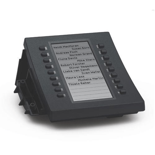 Increase the available function keys on D3xx phones with USB port, allowing users to manage a large number of extensions and calls. The D3 Expansion Module provides an additional 18 multicolored LED keys that can be programmed for functions such as line, speed dial, busy lamp field and presence indication. A multicolored LED key presents call or presence status, and the high-resolution display provides a visual interface that can be easily configured and labelled via the phone’s web interface or directly on the phone itself. The D3 connects to the telephone using a USB cable and up to three D3 expansion modules can be daisy-chained to provide 54 function keys.
