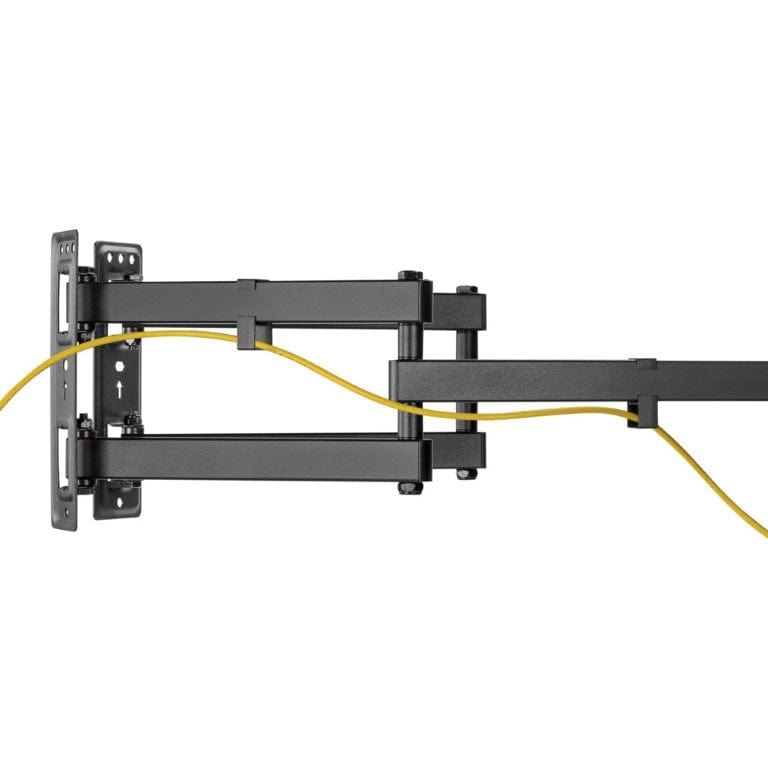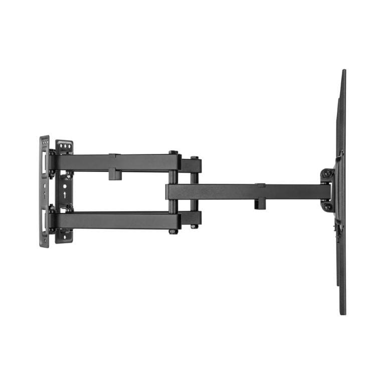 The LPA63-466C Full-Motion Corner TV Wall Mount fits most 32-70" TVs up to 45kg. With split arms, it can be installed easily on flat walls or the dead corner space. A full range of motion provides the user with wide viewing options and the ample swivel, tilt and extension ability positions the TV nearly anywhere. The +3°~-3° leveling adjustment ensures the TV is perfectly positioned. In addition, the integrated cable clips provide a clean and organized look.