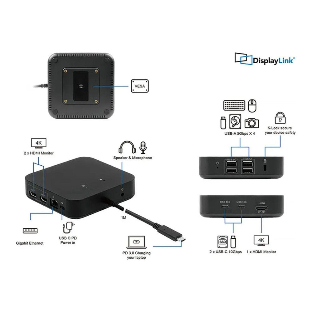 - Supports up to 3 monitors via HDMI 2.0 in Extended Mode and with 4K@60 Hz (DisplayLink driver needed)