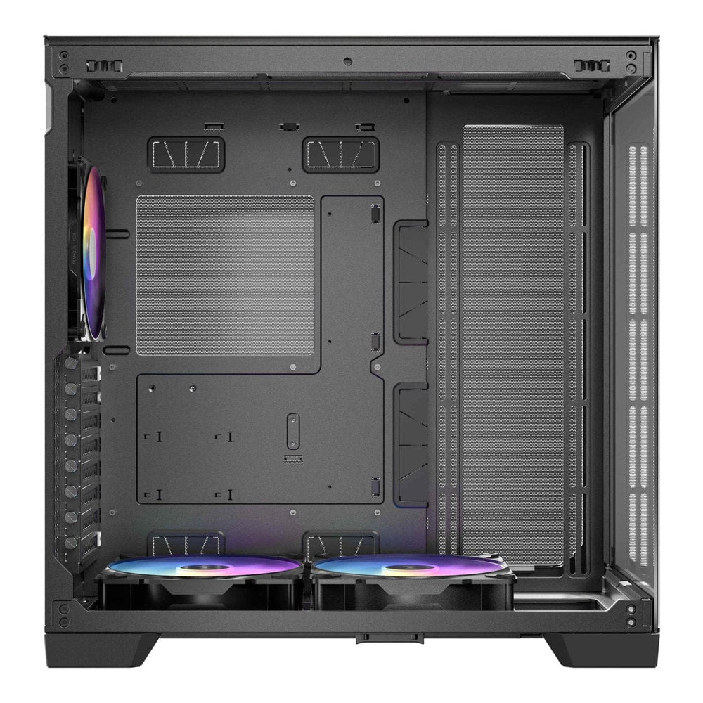 The front and left panel employ a unique 45° beveling technique that breaks the barrier between the two pieces of glass. The extremely fine edge of the glass joint enhances the uninterrupted, panoramic, and ultra-transparent visual experience of the 270° view, allowing comprehensive showcase of high-end PC components and dazzling lighting effects.