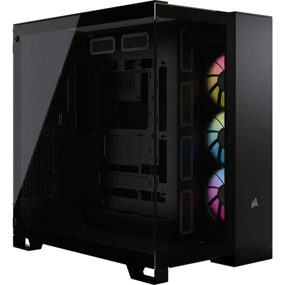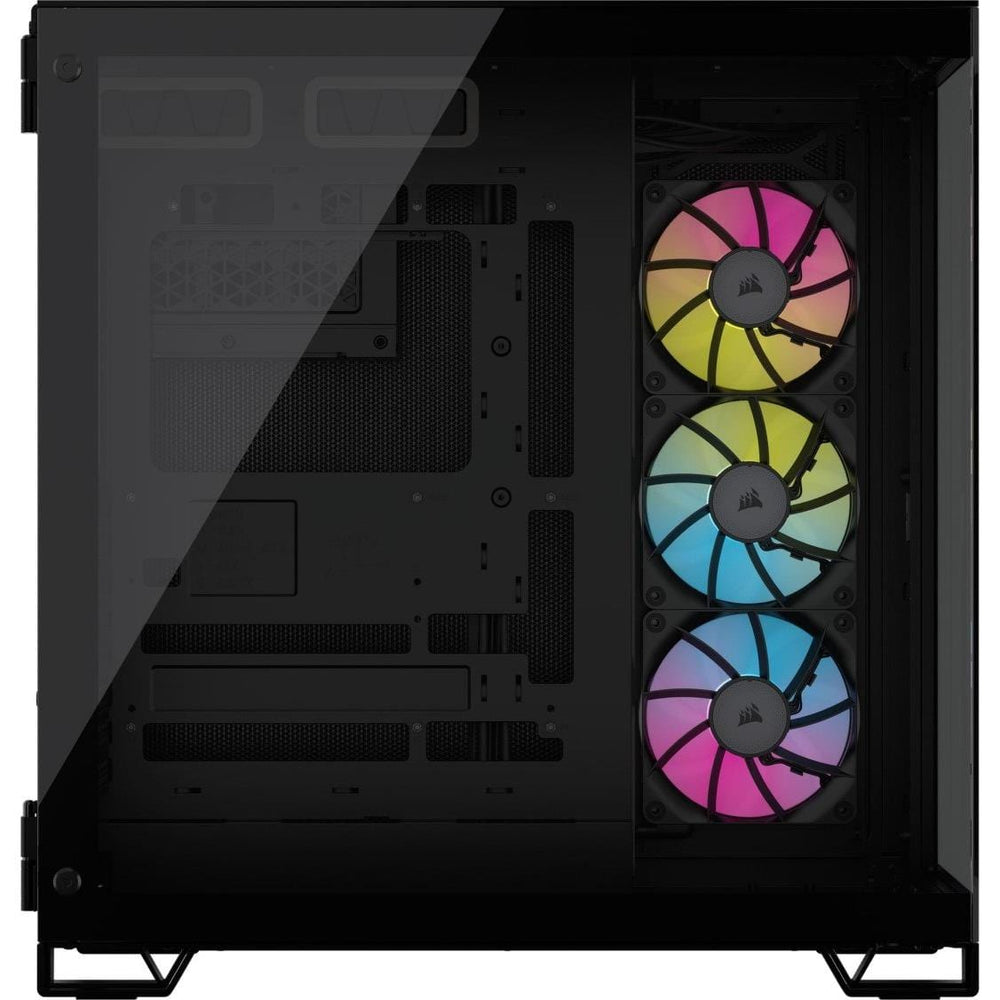 The CORSAIR iCUE LINK 6500X RGB Mid-Tower Dual Chamber PC Case organized view of your SFF PC through dual tempered glass panels, with three pre-installed RX120 RGB fans.