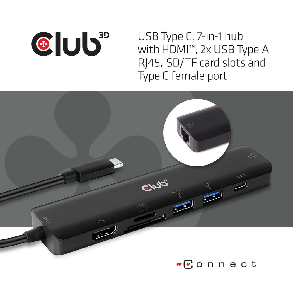 CSV-1592 - The Club 3D Hub is a USB Type C 7-in-1 Hub to HDMI™ 4K60Hz /SD-TF Card slot / 2x USB Type A / USB Type C PD / RJ45, providing an ideal solution for extending the port of USB Type C or Thunderbolt™ 3 host (PC/Laptop/tablet/Mobile phone, etc.),especially for the host with a single USB Type C port. This hub adopts the latest DP 1.4 Alt mode technology available today, enabling to output HDMI™ video with max 4k/60Hz and at the meanwhile transfer USB 3.1 data with max 5Gbps. 2x USB Type A ports allow you to connect 2 USB devices simultaneously.