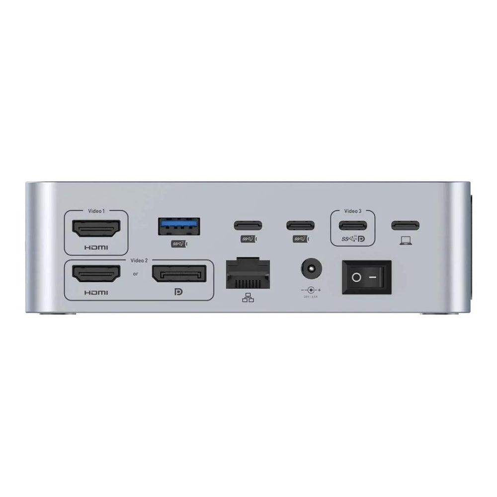 The SuperDock 2 features 2 HDMI, a DisplayPort as well as a USB-C port with DP Altmode capability. The DisplayPort (DP 1.4) and the USB-C DP Altmode video ports can reach up to 8K@30 Hz or 5K@120 Hz resolutions while the HDMI (HDMI 2.0) are capable of 5K@60 Hz. Dual monitors in Extended Mode are supported with a choice between Video 1 (HDMI #1), Video 2 (HDMI #2 or DP) and Video 3 (USB-C DP Altmode). The video signal is transmitted through DP Altmode protocol so check the host's video support for external monitors (limitations may apply in the number of external monitors through DP Altmode).