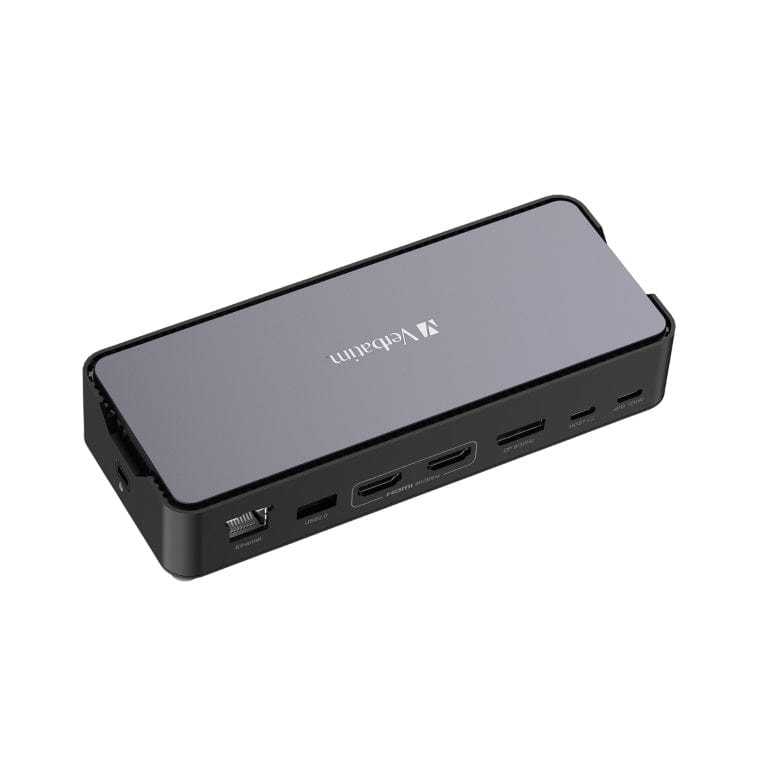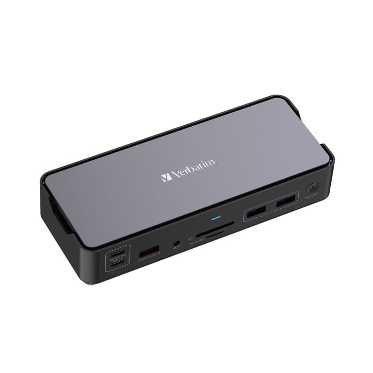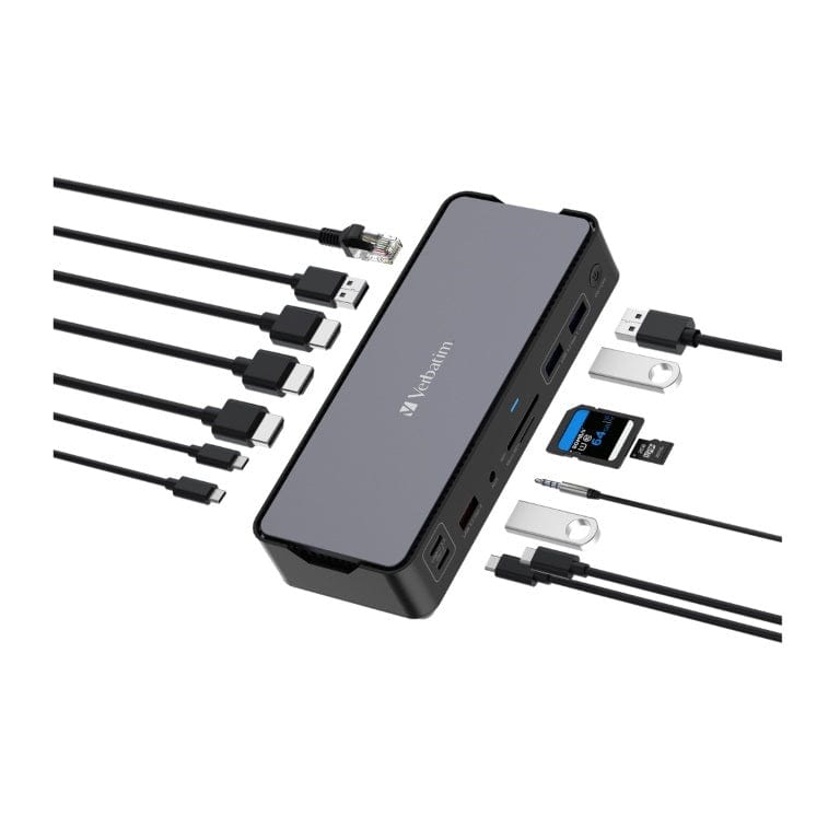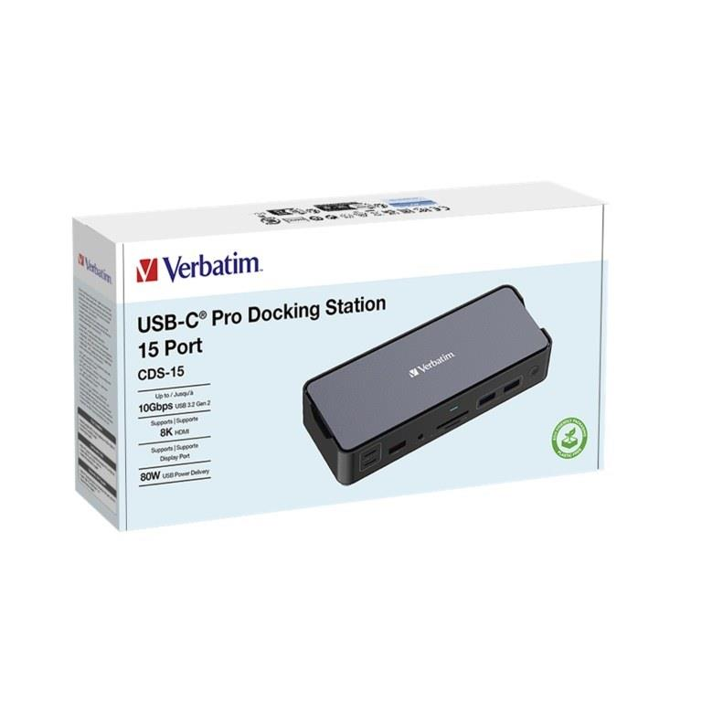 Streamline your workspace with the Verbatim USB-C Pro 15 Port Docking Station. This innovative device simplifies connectivity by consolidating multiple ports into one sleek solution. With a single USB-C® port, unlock the potential of fifteen versatile ports, including USB-A ports of various generations, SD and microSD memory card slots, an audio jack, RJ45 and DisplayPort connections, USB-C ports, and a USB-C PD port for seamless pass-through charging. Experience the future with support for 8K video output on a single screen or 4K resolution across triple displays.
