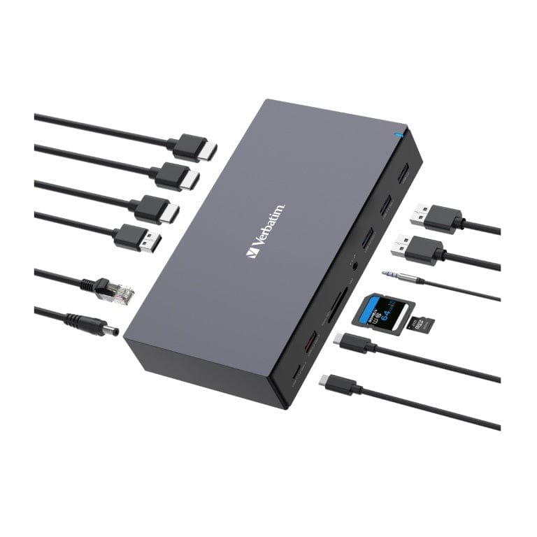 The Verbatim 17-port docking station boasts multiple monitor connectors, facilitating complex multi-display setups with ease. With five USB-A ports and a USB-C port, it's perfect for connecting a myriad of desktop accessories, from mice and keyboards to USB drives and external hard drives. Stay connected with the RJ45 port for wired network connectivity, while the SD and microSD ports cater to diverse memory card requirements.