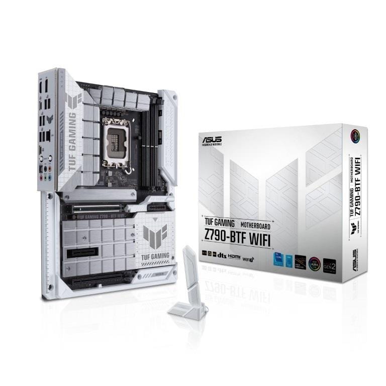 TUF GAMING Z790-BTF WIFI takes all the essential elements of the latest Intel® processors and combines them with game-ready features and proven durability. “BTF” means “Back To (the) Future” for a new era for all PC DIY gamers; the advanced BTF series not only hides all its connectors on the underside of the motherboard, but it also delivers up to 600 watts for BTF graphics cards through a graphics card high-power slot, for clean cable management and a minimalist build appearance.