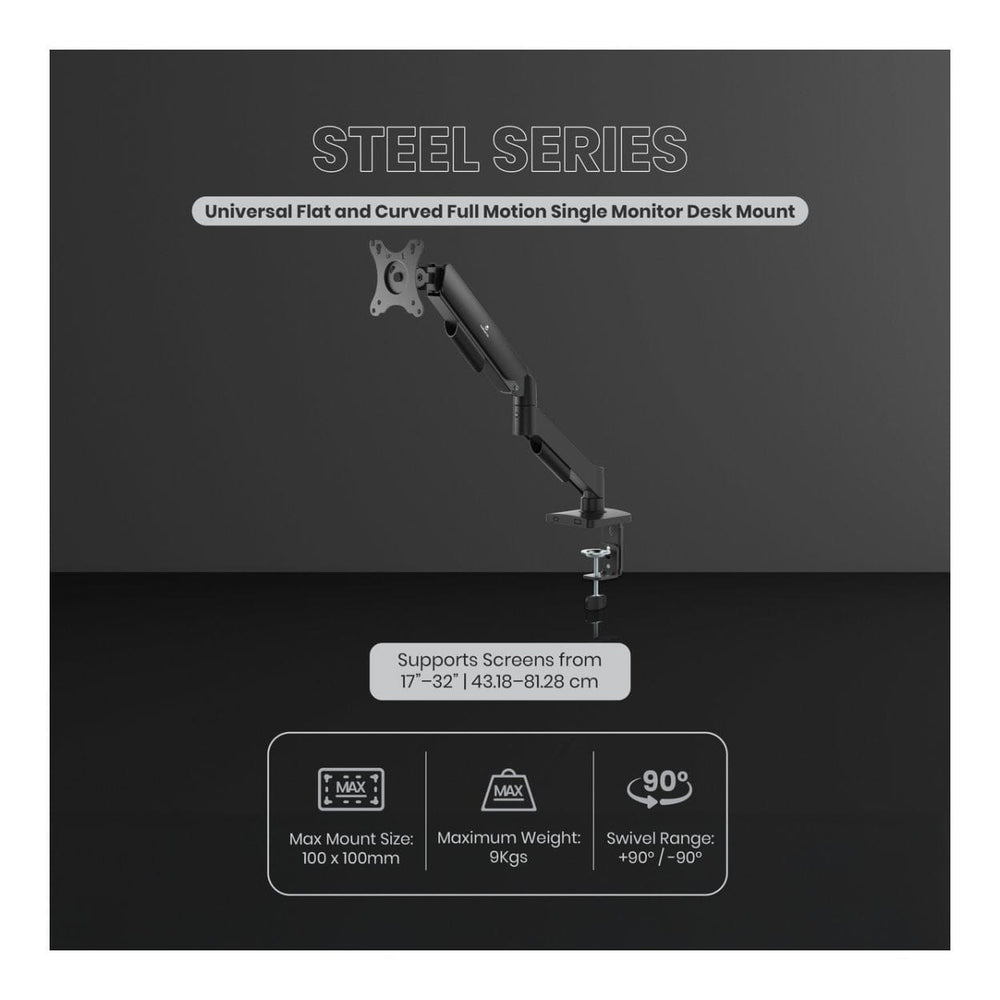The Volkano Steel Series Full Motion Single Monitor Desk Mount is designed to improve workspace comfort and efficiency by allowing flexible positioning of your monitor. Suitable for 17 to 32-inch screens, this sturdy desk mount supports smooth height, tilt, swivel, and rotation adjustments, helping reduce neck and eye strain while creating a clean, organised workstation.