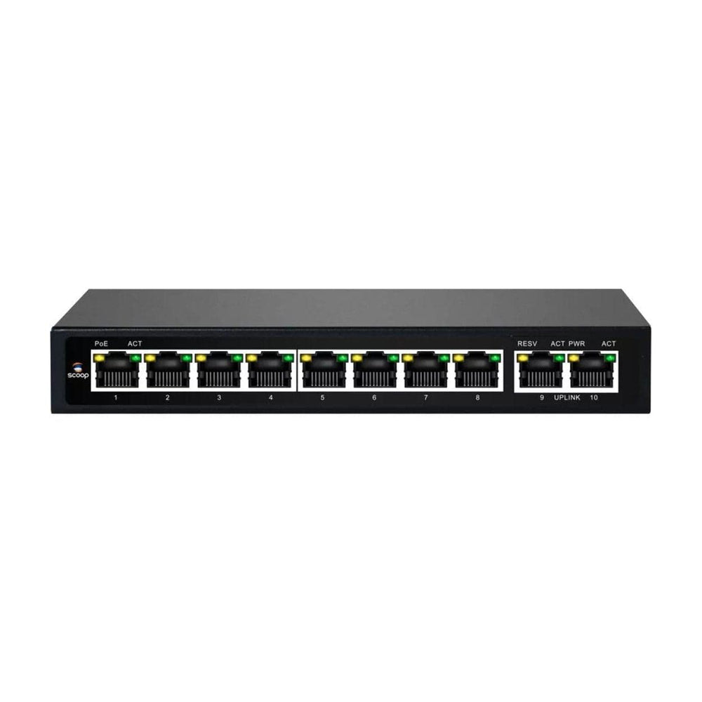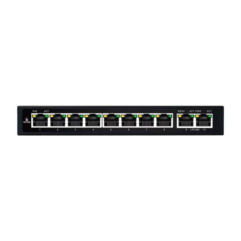 The Scoop SPS-8G2G is a powerful and efficient PoE switch, designed to support high-speed Gigabit connections while powering up to 8 PoE-enabled devices. With 10 total ports (8 Gigabit PoE and 2 Gigabit Ethernet), a 96W power budget, and AI-powered management, this switch ensures optimal network performance for applications like IP cameras, access points, and VoIP systems. Perfect for growing businesses or medium-sized networks, it provides both reliable power and fast data transmission.