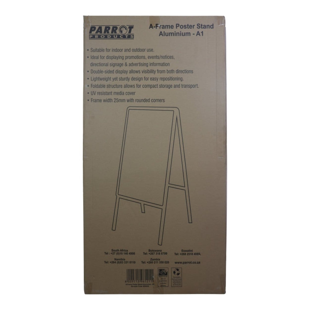 Display your posters, notices, or promotional materials in style with the Parrot A1 Poster Aluminium Frame Stand. Designed for durability and ease of use, this freestanding unit features a sleek aluminium frame with a snap-open mechanism for quick poster changes. Ideal for offices, retail spaces, exhibitions, or events.
