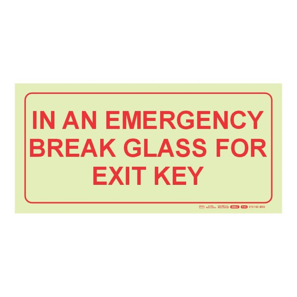 - 1 × Parrot Photoluminescent Safety Sign – F43 “In An Emergency Break Glass For Exit Key” (190 mm, Model SNP19F43)