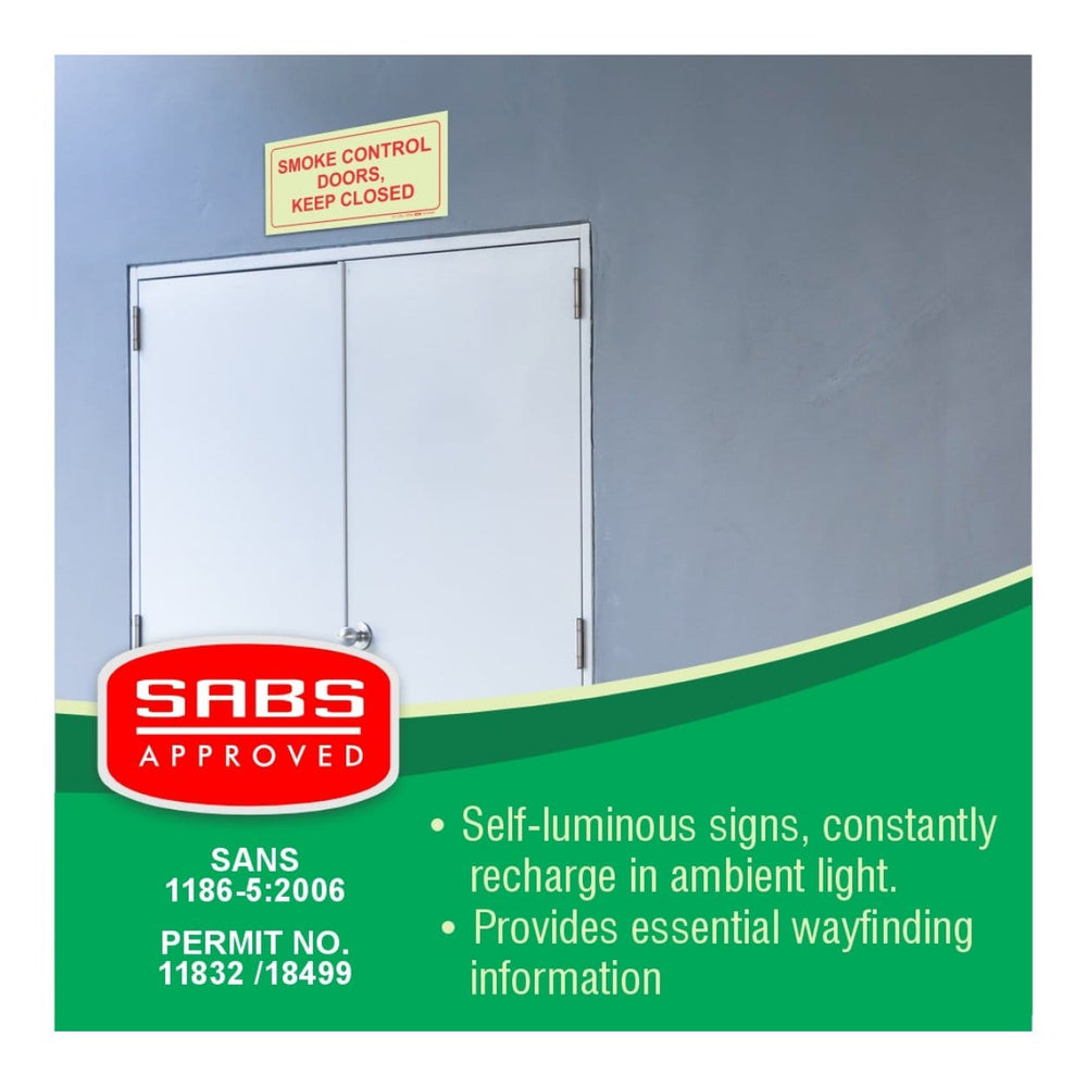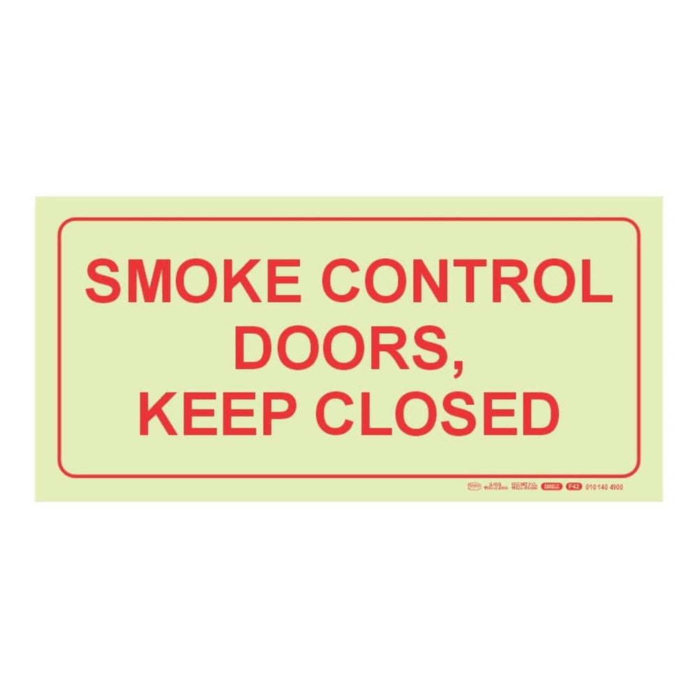 - 1 × Photoluminescent 190 mm Safety Sign – F42 “Smoke Control Doors Keep Closed” (Model SNP19F42)