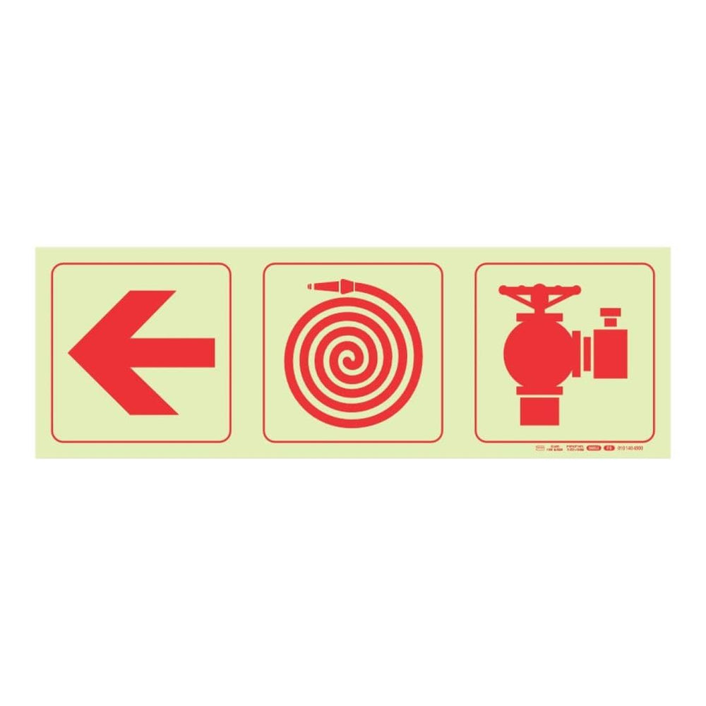 • Clear directional arrow pointing left with fire hose reel and fire hydrant symbols for quick identification