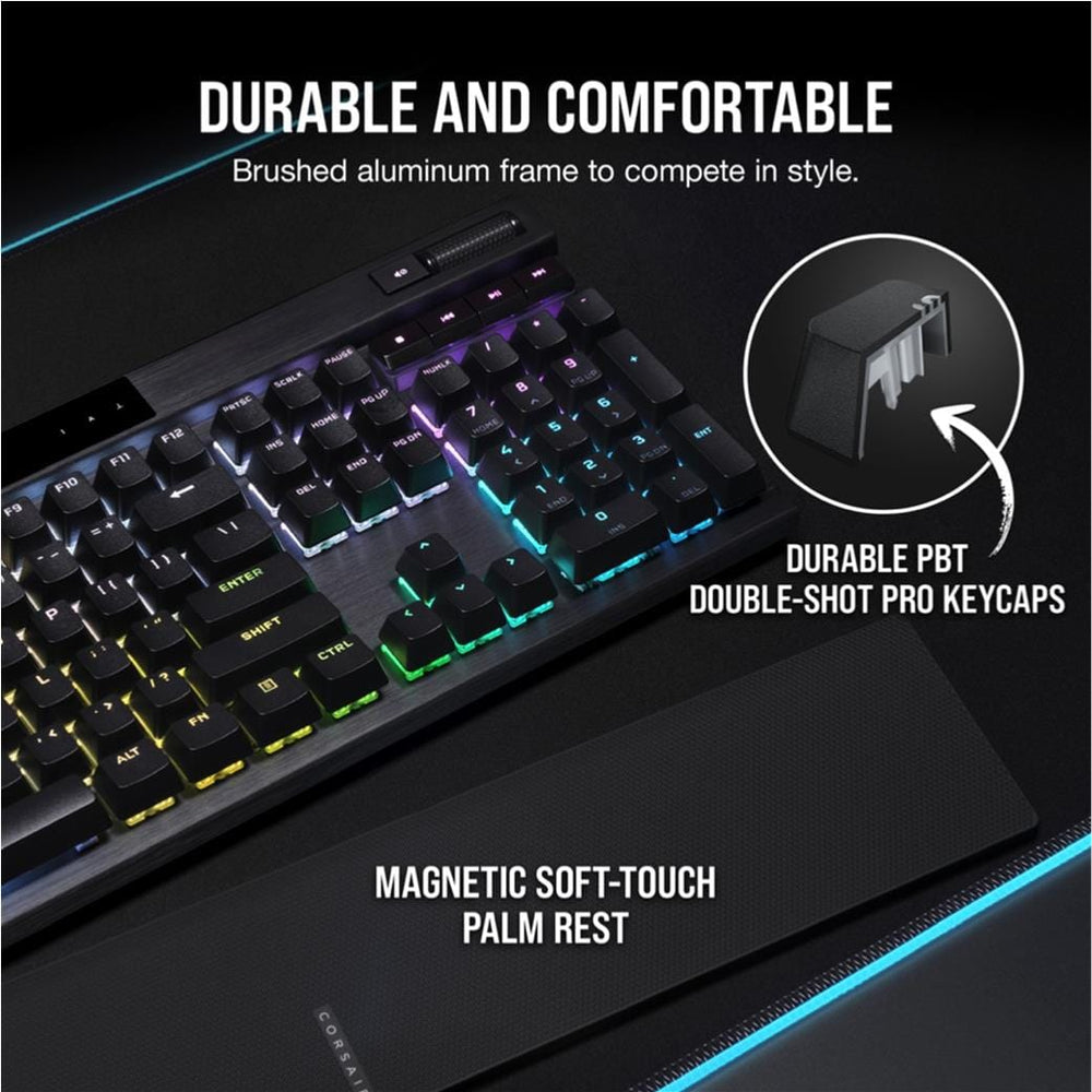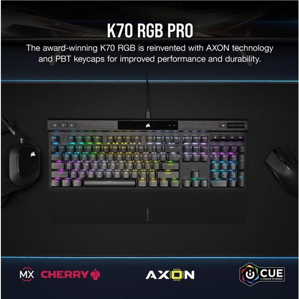 THE LEGEND CONTINUES The K70 RGB PRO retains the iconic elements of our award-winning K70 series with a durable aluminum frame, CHERRY MX mechanical keyswitches, and per-key RGB backlighting, while setting a new bar for performance with AXON technology and a tournament switch. POWERED BY AXON Axon logo AXON delivers a new level of performance by processing and transmitting your inputs up to 8x faster than conventional gaming keyboards with 8,000Hz hyper-polling, 4,000Hz key scanning, and up to 20 layers of hardware RGB lighting processing while maintaining speed performance. LINEAR AND FAST 100% mechanical keyswitches delivering lightning-fast response times with a 1.2mm actuation distance, perfect for fast-paced gameplay. DURABLE PBT DOUBLE-SHOT PRO KEYCAPS A precision-molded keycap set with a standard bottom row layout resists wear, fading, and shine, with 1.5mm thickness for rigid stability. K70 RGB PRO & iCUE Powerful CORSAIR iCUE software on both Windows and macOS enables dynamic RGB lighting control, key remaps and macro programming, and exclusive iCUE integrations with select games that turn your entire system’s lighting into an extension of the action. UNITE YOUR SETUP CORSAIR iCUE software brings your entire setup together, creating a fully immersive ecosystem with intuitive control. EXPLORE iCUE
