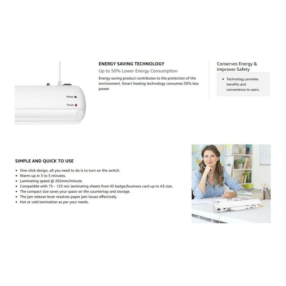The 3 to 5-minute warm-up and speed of 265 mm/minute satisfy the daily lamination demand. Ability of continuous working, simple and quick to use, wide compatibility of 75-125mic from ID card to A3-size make it ideal for home and classroom as a personal laminator.