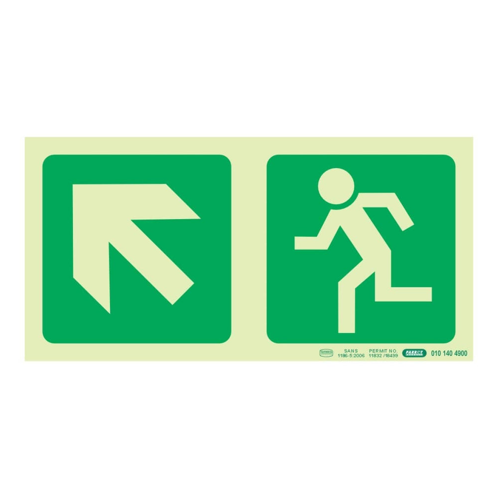 Parrot Photoluminescent 190mm Safety Sign E12 Diagonal Arrow Up And Left and Running Man SNP19E12