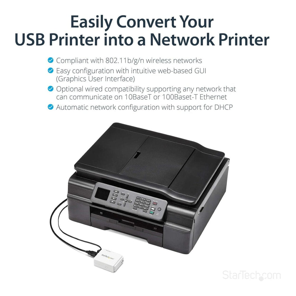 This compact wireless print server supports 802.11b/g/n wireless standards for functionality with almost any wireless network, plus, serving as a primary or backup interface the print server also offers an RJ45 port for 10/100 Mbps wired connections.Providing wireless network printing access enables you to place your printer in any location with network access and avoids the added cost of purchasing individual printers for each workstation or area.