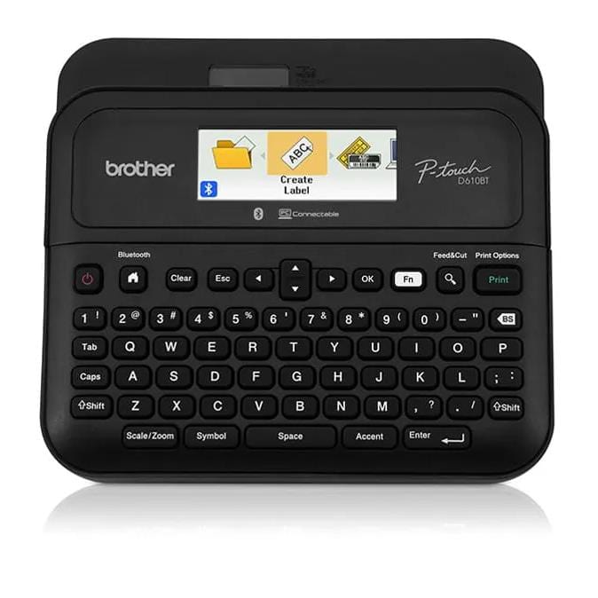 The pinnacle of business and inventory organization! Featuring high resolution printing for sharper barcodes, crisp logos, and detailed graphics. Connect and Create labels for your workspace using your computer or mobile device (Android™ or iOS®) with the P-touch PT-D610BT Business Professional Connected Label Maker. Use the Brother P-touch Editor software1 and iPrint&Label app to create and print from your PC, or mobile device over Bluetooth®. Advanced connectivity allows multiple users to work with the same label maker from their own computer or smart device as they need! Or simply use the built-in QWERTY keyboard to quickly tap out a label when you need it. Increase efficiency on high volume labeling jobs with faster printing and a built-in automatic label cutter. So where do you need Brother P-touch label makers the most? In busy retail stores and services with lots of customer traffic. In packed warehouses and storerooms when you need to manage inventory that’s constantly coming and going. Where you need to track customer and employee possessions in lockers and bins or print ID badges. If keeping track of your assets, inventory, or employee equipment has been preventing you from focusing on the ins and outs of your business, this is the label maker you and your business needs.