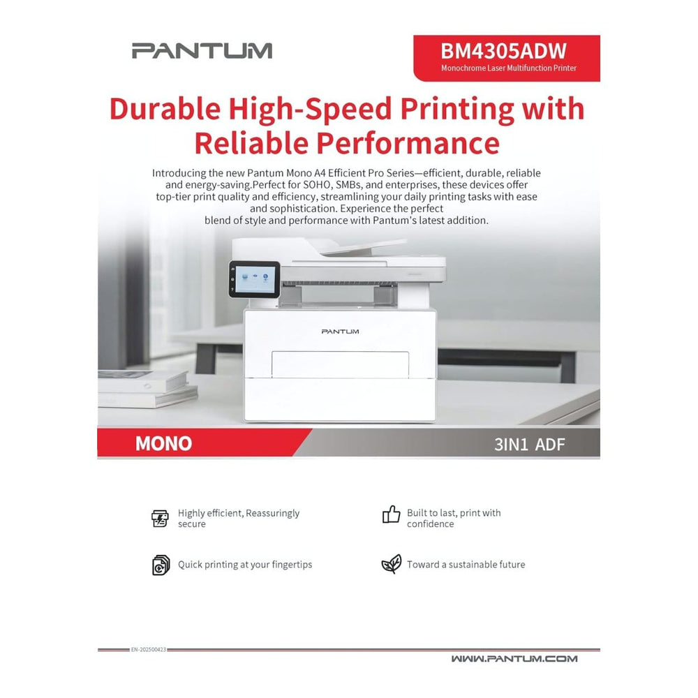 Boost your productivity with the Pantum Efficient Pro series swift printing speeds of up to 33 ppm (A4) / 35 ppm (Letter). Enjoy the convenience of automatic duplex printing, save paper and costs, and meet the needs of demanding office environments.