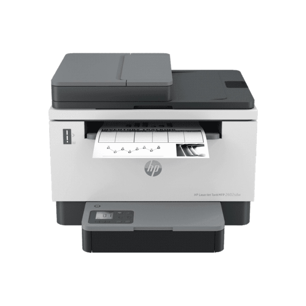 Discover business-ready capabilities and savings with HP LaserJet Tank MFP 2602sdw All-in-One Printer pre-filled with up to 5,000 pages of Original HP Toner.