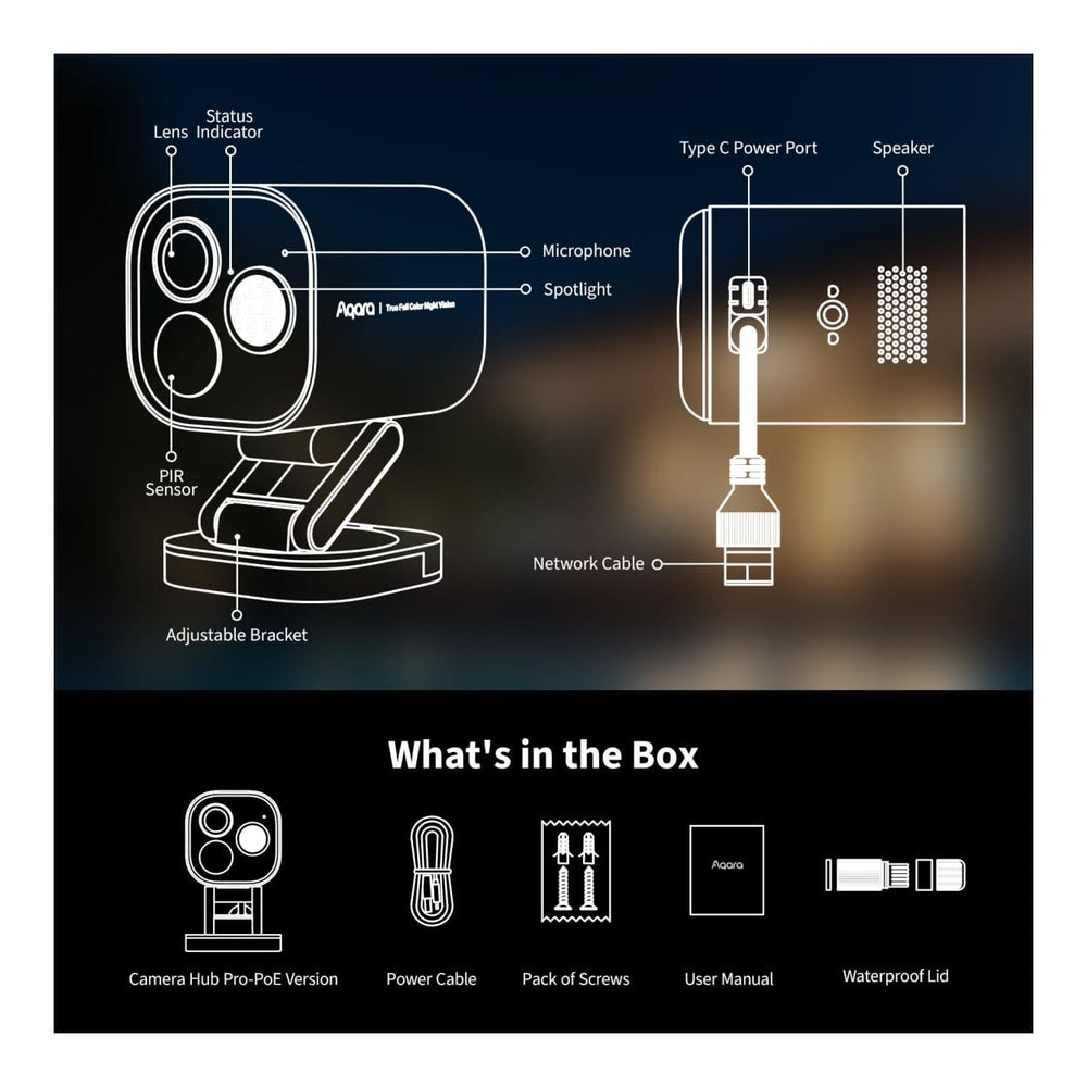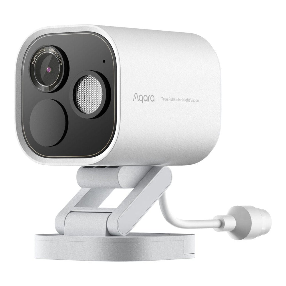 The Aqara Camera Hub G5 Pro CH-C03D-WHITE is a wired security camera with PoE (Power over Ethernet) support and an integrated smart home hub for Matter, Zigbee 3.0, and Thread protocols. It captures 2K (2304 x 1296) resolution video and offers a 152° wide-angle view with pan and tilt functionality (340° horizontal, 60° vertical) for comprehensive area coverage. Features include local AI-powered facial recognition, pet detection, and human recognition to differentiate alerts. The device supports two-way audio and offers multiple storage options, including local microSD card storage (up to 512GB) and cloud storage. It has a built-in privacy shutter and is designed for indoor use.