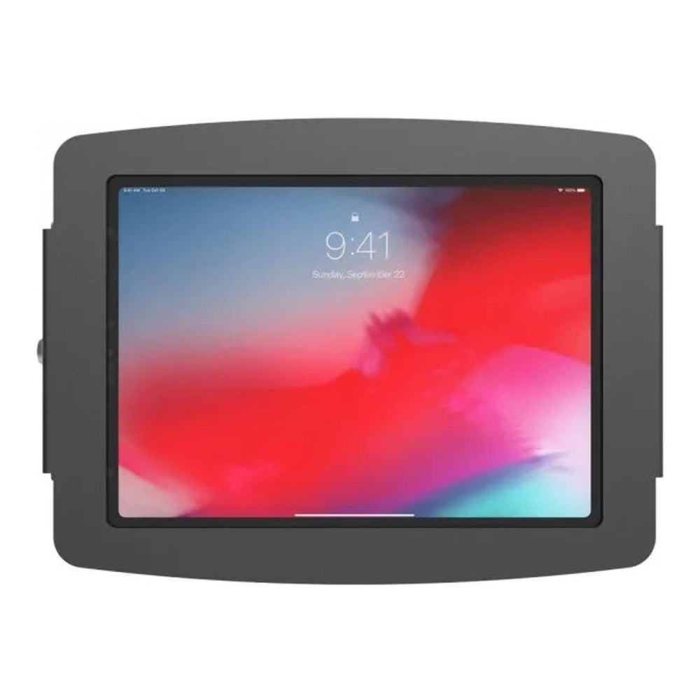 The Space iPad Enclosure features rounded edges and open corners for improved ventilation and allows for limited access to buttons and inputs. Included is a removable home button cover to restrict access to the main button.