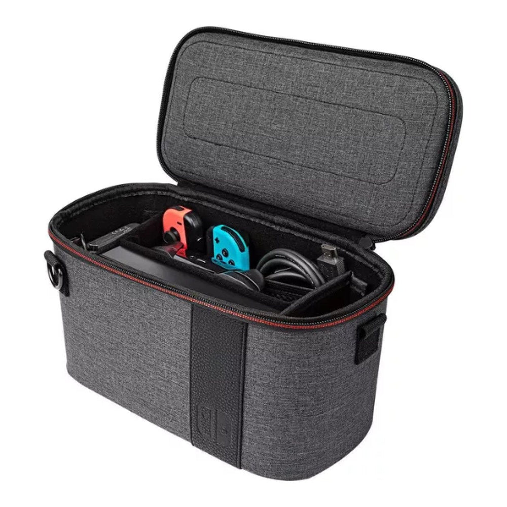 Stores the Nintendo Switch, Nintendo Switch Lite, or Nintendo (OLED Model) consoles, the console dock, Pro Controllers, AC adapter, HDMI cords, extra Joy-Con