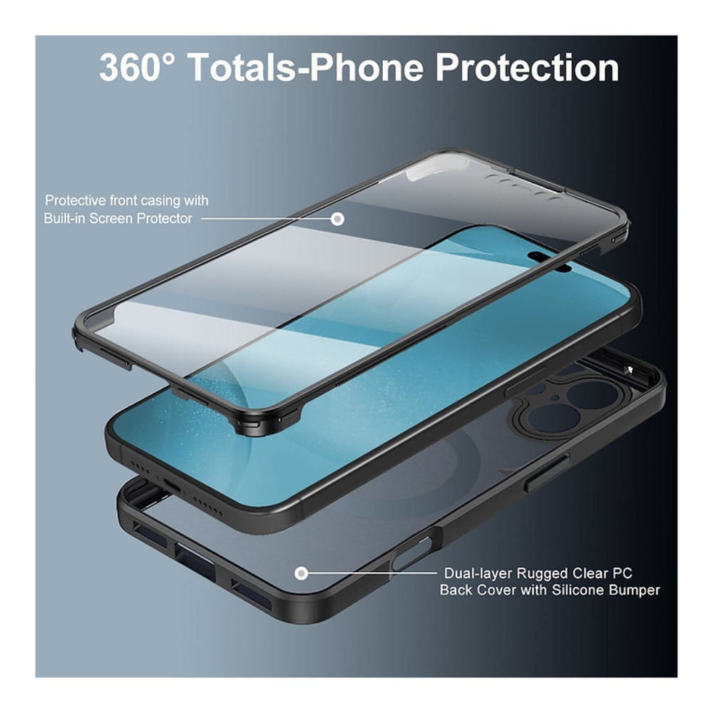 Protect your device with this MagSafe-compatible case featuring a built-in screen protector for 360° coverage. Designed with dual-layer construction, it offers military-grade drop protection with reinforced air guard corners and a shockproof bumper. The transparent back panel keeps your device looking sleek while resisting scratches. Built-in magnets align perfectly for strong MagSafe connections, making charging and accessory use effortless. Slim, durable, and comfortable to hold, this case provides full protection without adding unnecessary bulk-ideal for everyday use, travel, and work.