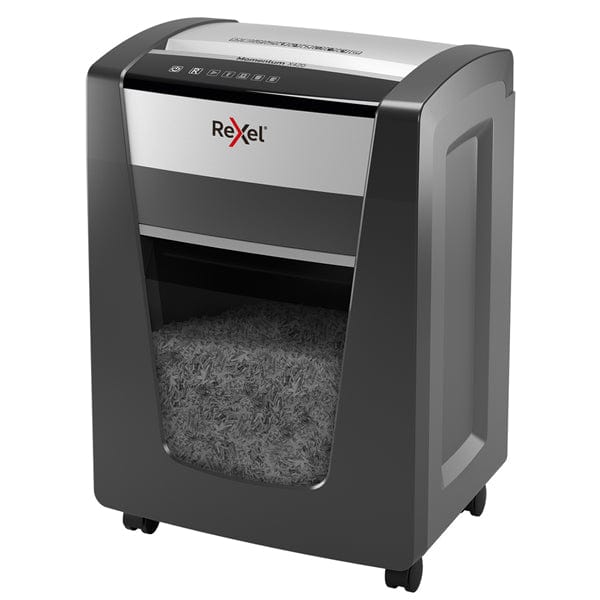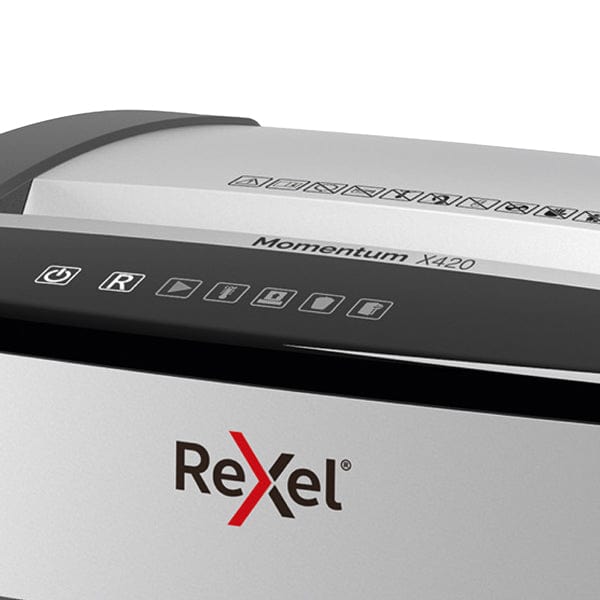 Rexel Momentum X420 Paper Shredder shreds up to 20 sheets in one go, with a 4 hour continuous run time, making it ideal for a small office. The X420 comes with anti jam technology to guarantee uninterrupted shredding. P4 Cross Cut 4x40mm pieces. Quiet, with simple, intuitive, touch control buttons for easy operation and a generous 30L bin capacity (275 A4 shredded paper sheets)