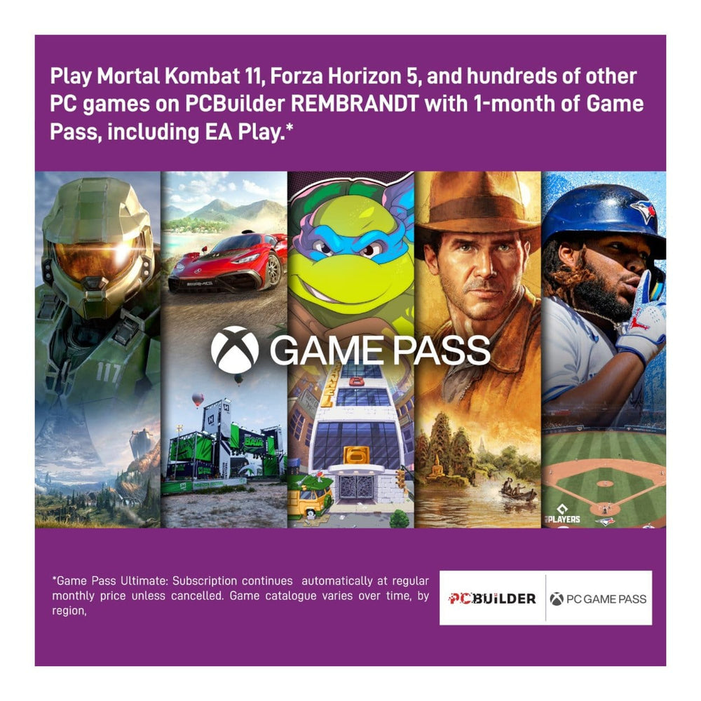 The PCBuilder REMBRANDT Windows 11 Creator PC also includes one month of PC Game Pass, including EA Play. Play over 100 high-quality PC games, in various genres such as Halo Infinite, Forza Horizon 5, and Minecraft on your new gaming rig. With new games added all the time, there’s always something new to play from day one.