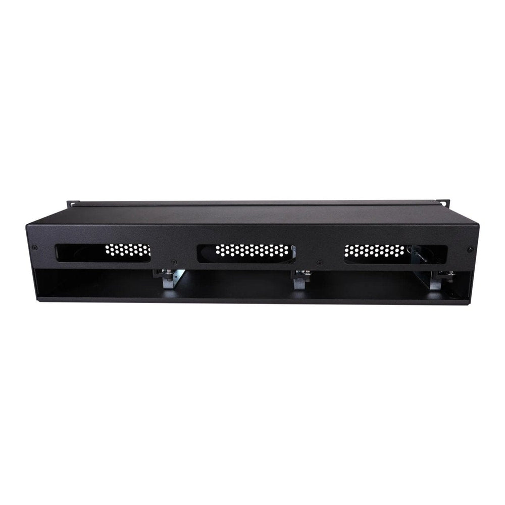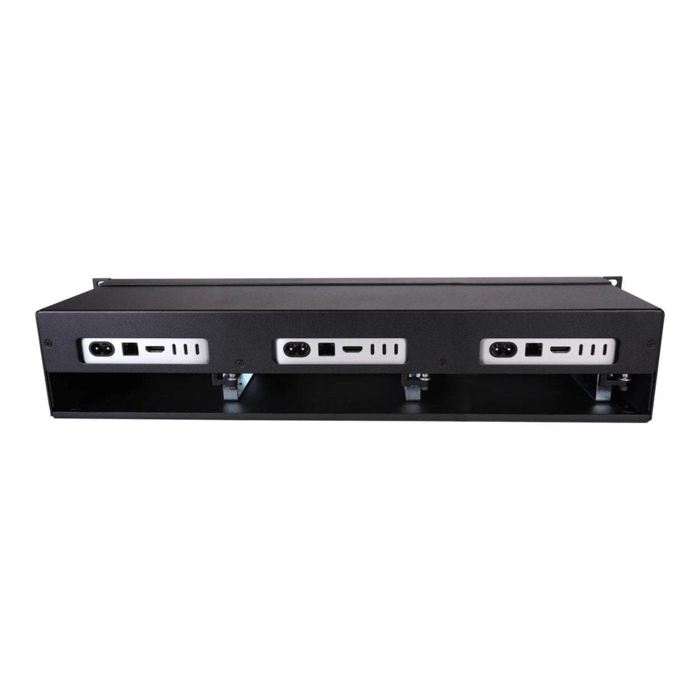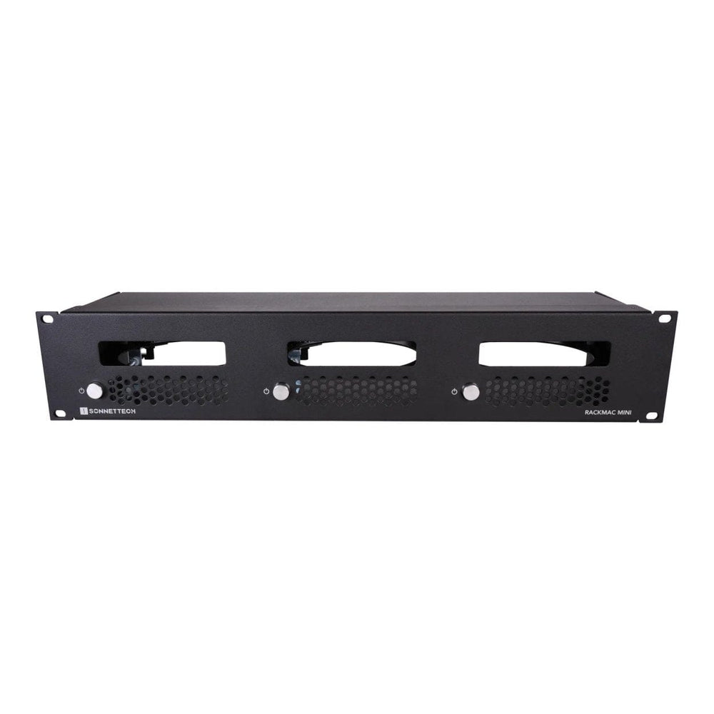 RackMac mini (2024+) is a rugged steel 2U rackmount enclosure for securing three Mac mini computers side-by-side in a rack, placing them behind an efficient and protective front panel. Convenient front panel operation allows you to turn Mac minis on and off with their own dedicated front power buttons. Front and rear panel openings provide access to all the computers’ ports, enabling you to connect and disconnect cables easily without needing to remove the computers from the enclosure. For added convenience, cable passthroughs on the front panel enable connection of peripherals.