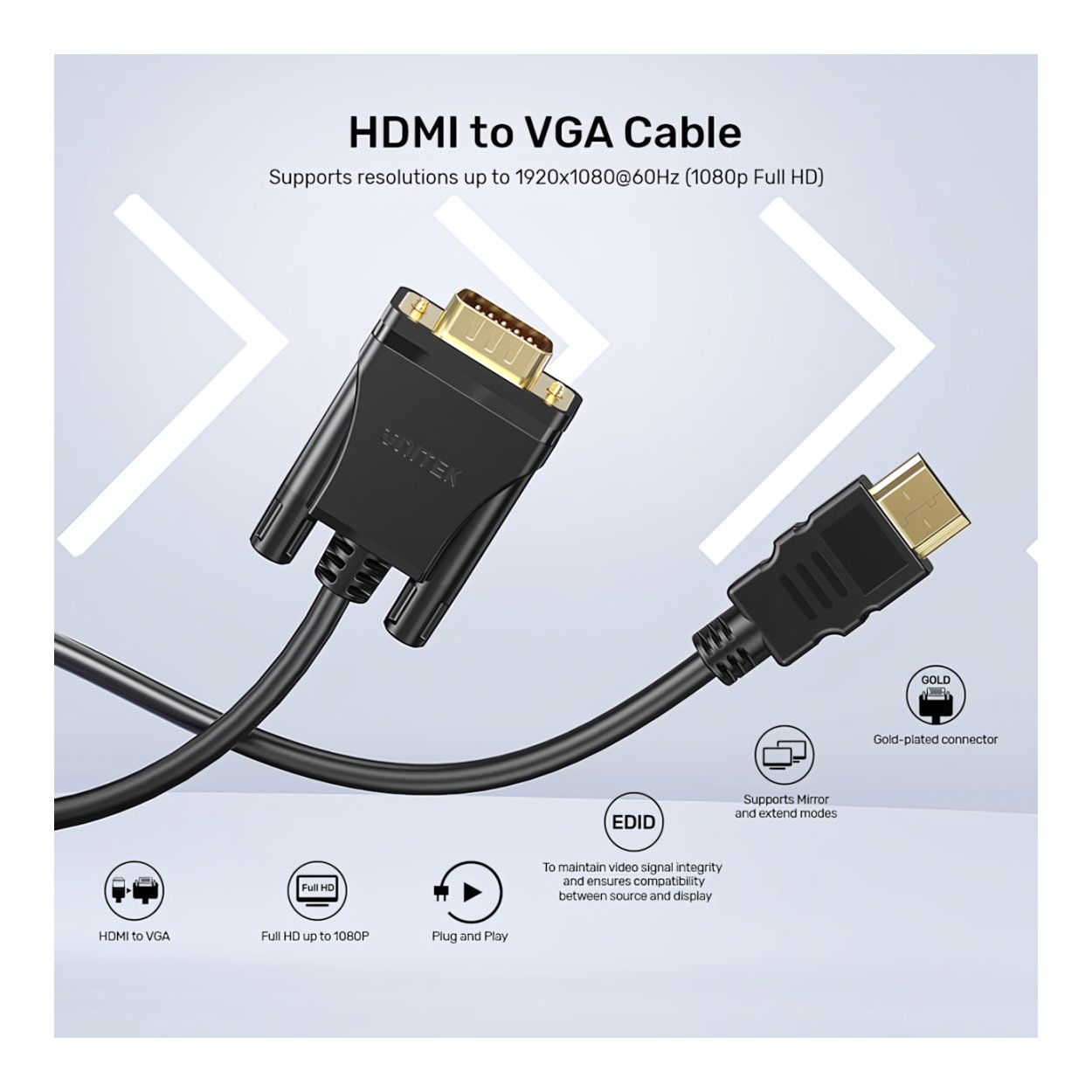 The UNITEK HDMI to VGA Cable provides an affordable and effective solution for connecting your desktop, laptop, or other HDMI-enabled devices to VGA displays such as monitors, projectors, or TVs. It supports resolutions up to 1920x1080@60Hz (1080P Full HD) for a clear viewing experience.