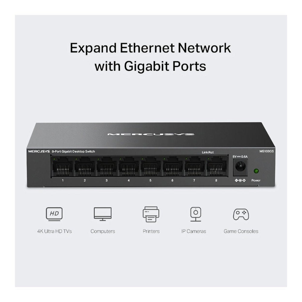 Quickly expand your wired network with eight 10/100/1000 Mbps Ethernet ports—10 times faster than regular 10/100 Mbps Ethernet ports. MS108GS is flexible and fully compatible with 4K Ultra HD TVs, computers, printers, IP cameras, game consoles, and more. This makes it perfect for use in home, small office, and even dormitory environments.