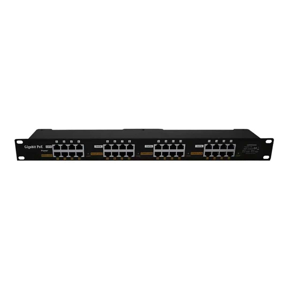 Scoop's POE-16G is a 16-Port Gigabit Passive PoE injector with dual power supplies for both Mode A and Mode B operation. The unit supports an input voltage of 24-57V and is rack-mountable.