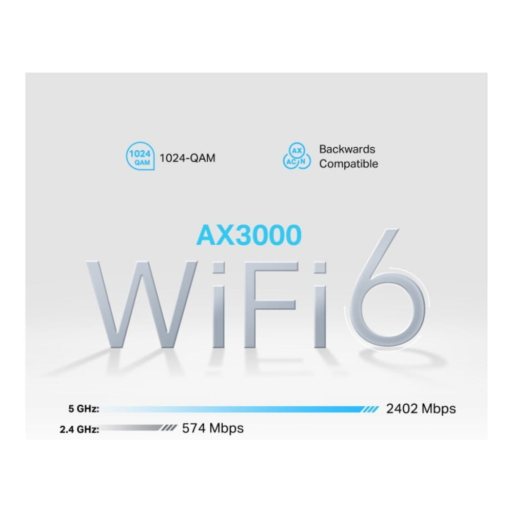 - AX3000 Dual-Band Wi-Fi 6 Speed: 2402 Mbps (5 GHz) + 574 Mbps (2.4 GHz).