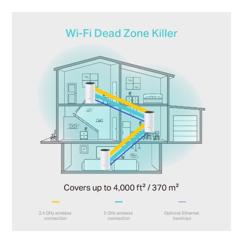 Deco M4 is the simplest way to guarantee a strong Wi-Fi signal in every corner of your home up to 4,000 square feet (3-pack, EU version). Wireless connections and optional Ethernet backhaul work together to link Deco units, providing even faster network speeds and truly seamless coverage.