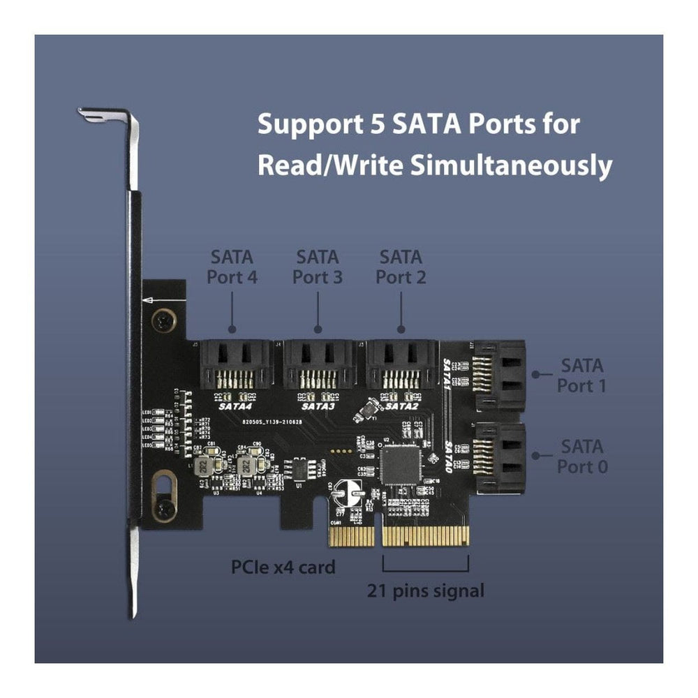 This 5-Ports SATA III 6Gbps PCIe x4 Host card is designed for adding additional SATA III ports to your system. This small card will fit regular and slim or low profile chassis, ideal for any system with a PCIe x4 slot. When installing into Windows 10, not drivers are required, just plug and it is ready to add your drives like SSD, HDD, and Optical Drive*. You can use it for HDD, SSD, Optical drive, and more. The wide PCIe path will allow for a fast transfer speed. It is will support your new system with PCIe v3.0.