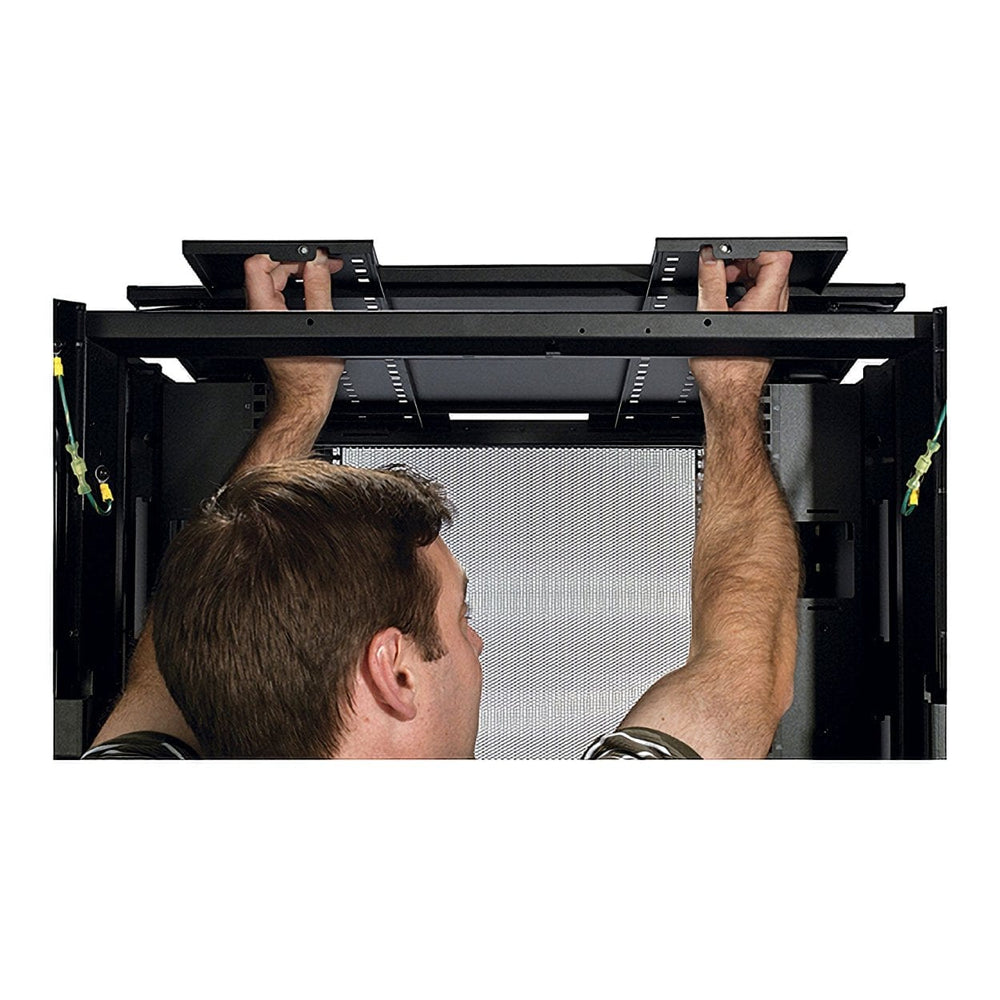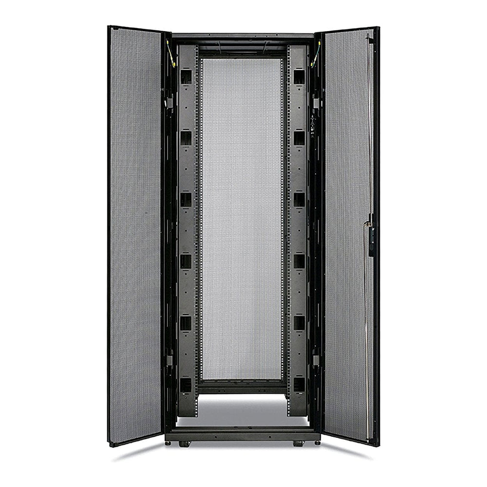 An industry standard server rack ready for medium to high density environments with height designed to easily fit through standard doorways. Wide rack design allows for additional space beside the vertical mounting rails for passing cabling from front-to-back in the enclosure. It provides plenty of clearance at the back for Rack PDUs and cable managers not to interfere with IT device hot swappable components. The width is ideal for converged and hyperconverged IT which include a mix of server, storage, and network switches all in one rack.