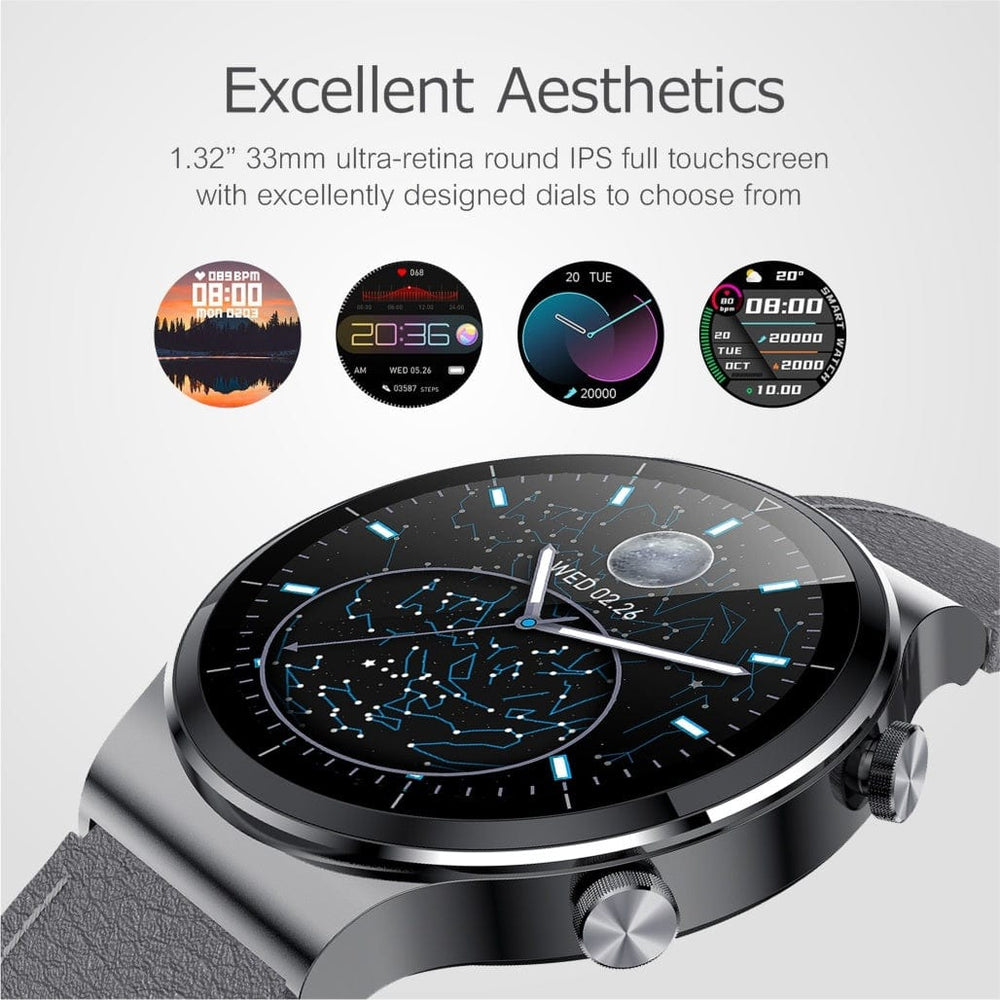 1.32 inch 33mm ultra-retina round IPS full touchscreen with excellent HD colorful customizable dials and lightweight metal body.