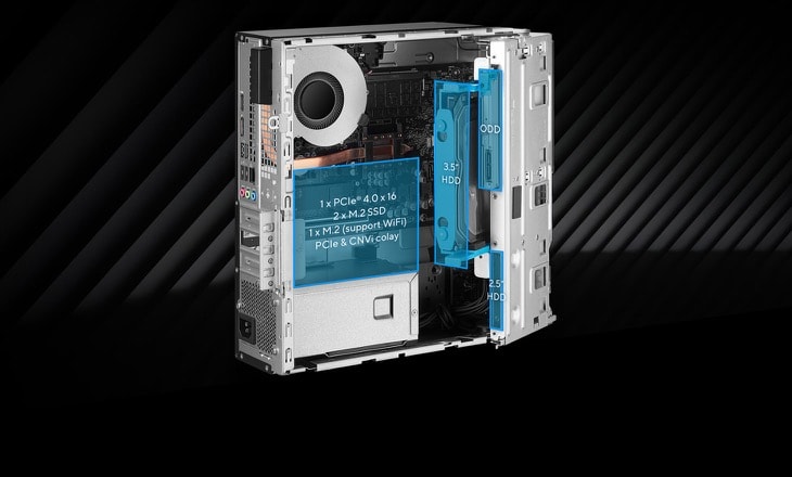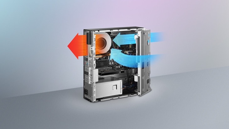 ASUS ExpertCenter P500 SFF features our innovative compact air cooler for exceptional thermal control. Unlike traditional tower PCs, we add a copper heat pipe to rapidly transfer heat away from critical components. Plus, our design positions a high-efficiency fan at the rear, creating an optimized airflow path that draws cool air from the front and sides while expelling heat through the back. This combination of strategic airflow and advanced heat pipe technology ensures optimal temperatures even during demanding tasks, delivering powerful performance without compromise in a compact design.
