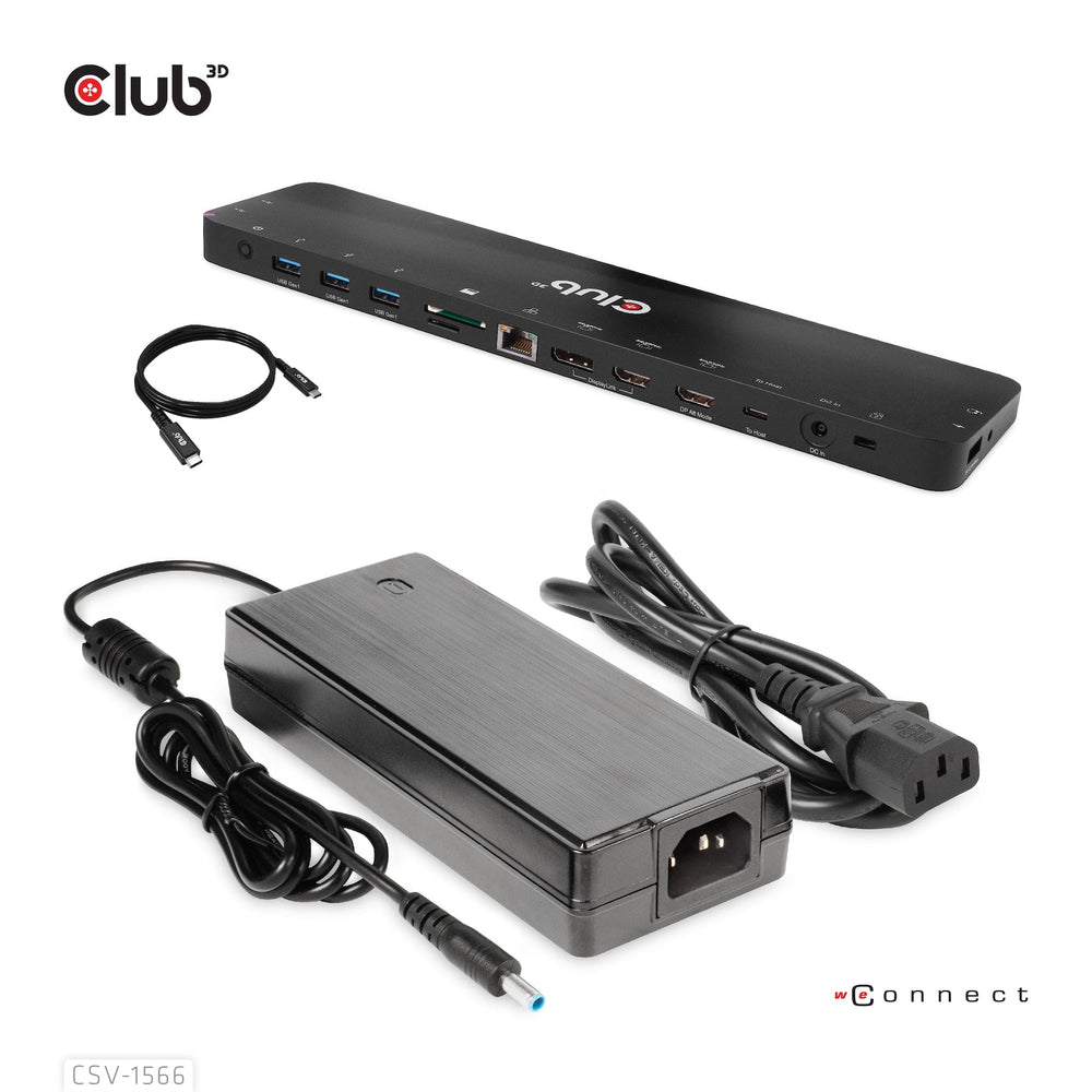 The Club 3D CSV-1566 USB Gen1 Type-C Triple Display DP Alt mode + Displaylink/ USB mode Dynamic PD Charging Dock with 120 Watt PS, is an integrated solution combining Video, Data, Power, Ethernet and Audio. This Dock is perfectly suited for extending a Type-C port or USB-A port(via a Type-C to USB converter) to provide multiple audio, video, data and power ports, providing an ideal solution to satisfy users who require multiple ports. This dock has 3 video ports (2 HDMI™, one from DP™1.2 Alt mode, one from USB mode, 1 Displayport™ from USB mode) for video experience, 4 USB Gen1 Type-A and 1 USB Gen1 Type-C for data transmission, RJ45 for super high speed Ethernet, SD/TF card slots for connecting memory cards. Besides, it has a smart charging port, bringing fast charging performance for connected mobile devices (Apple, Samsung phones, pads, etc). A 120W power adapter is provided to supply power for the function of this dock and charge the host with a max 80W (20V/4A). This dock is a bottom design with can be put underneath the host. It can work on DP™1.2 Alt mode supported USB Type-C and -A hosts.