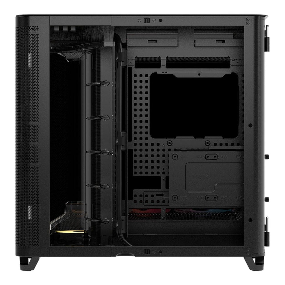 Two glass panels connect in the corner of the chassis and open outwards with hinges that disappear for a seamless look and easy access to your hardware.