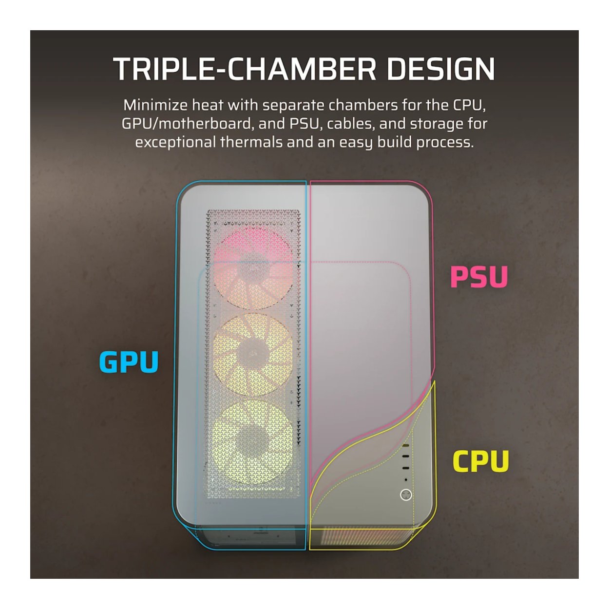 A unique triple-chamber design was created to isolate hot components for effective cooling and maximum performance at all times. Separate chambers for the CPU, GPU/motherboard, and PSU, cables, and storage allow for exceptional thermals and an easy PC building process.