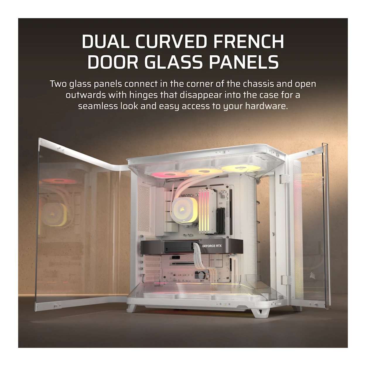 Two glass panels connect in the corner of the chassis and open outwards with hinges that disappear for a seamless look and easy access to your hardware.