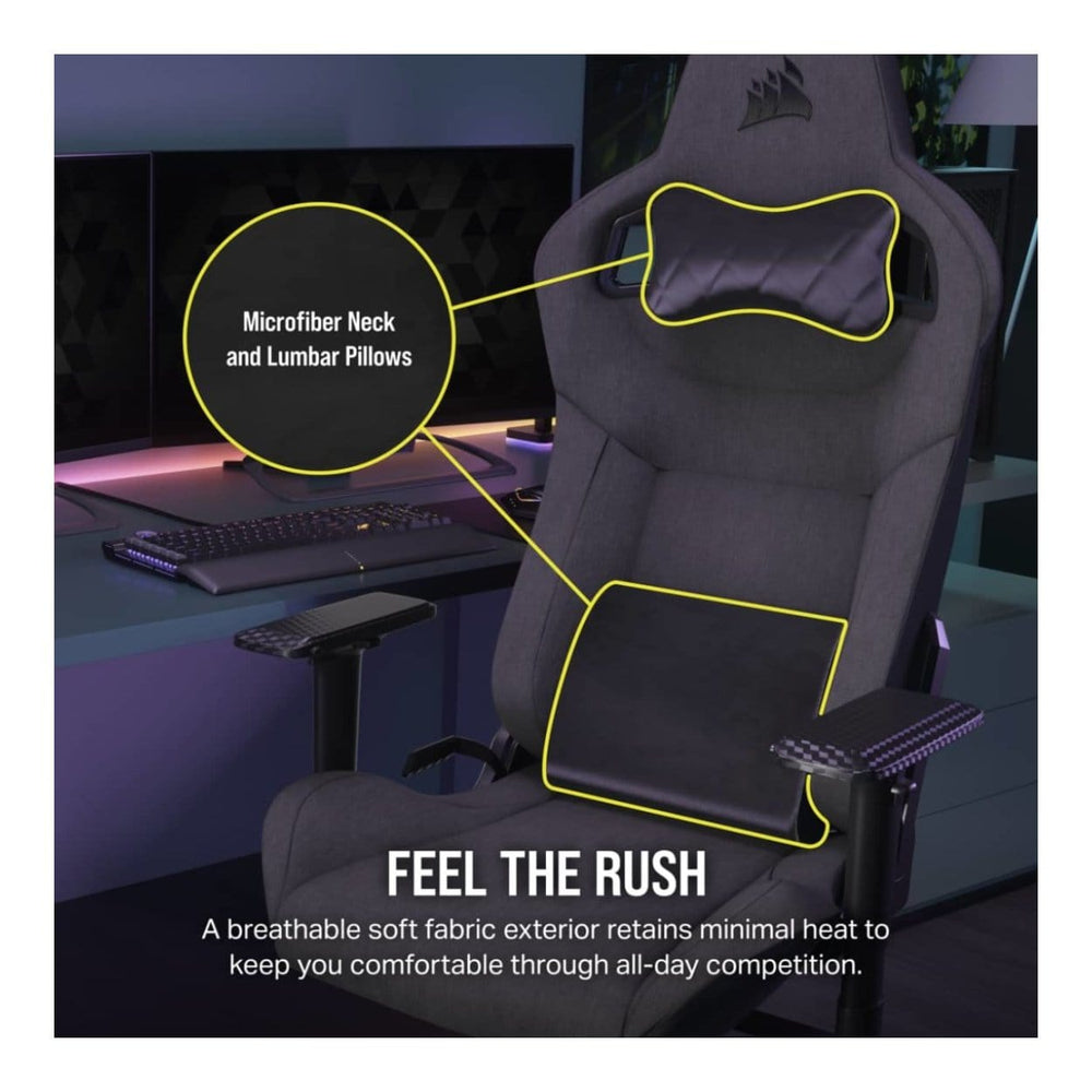 The CORSAIR T3 RUSH gaming chair combines racing-inspired design and contoured comfort, with a breathable soft cloth exterior, padded neck cushion and memory foam lumbar support.