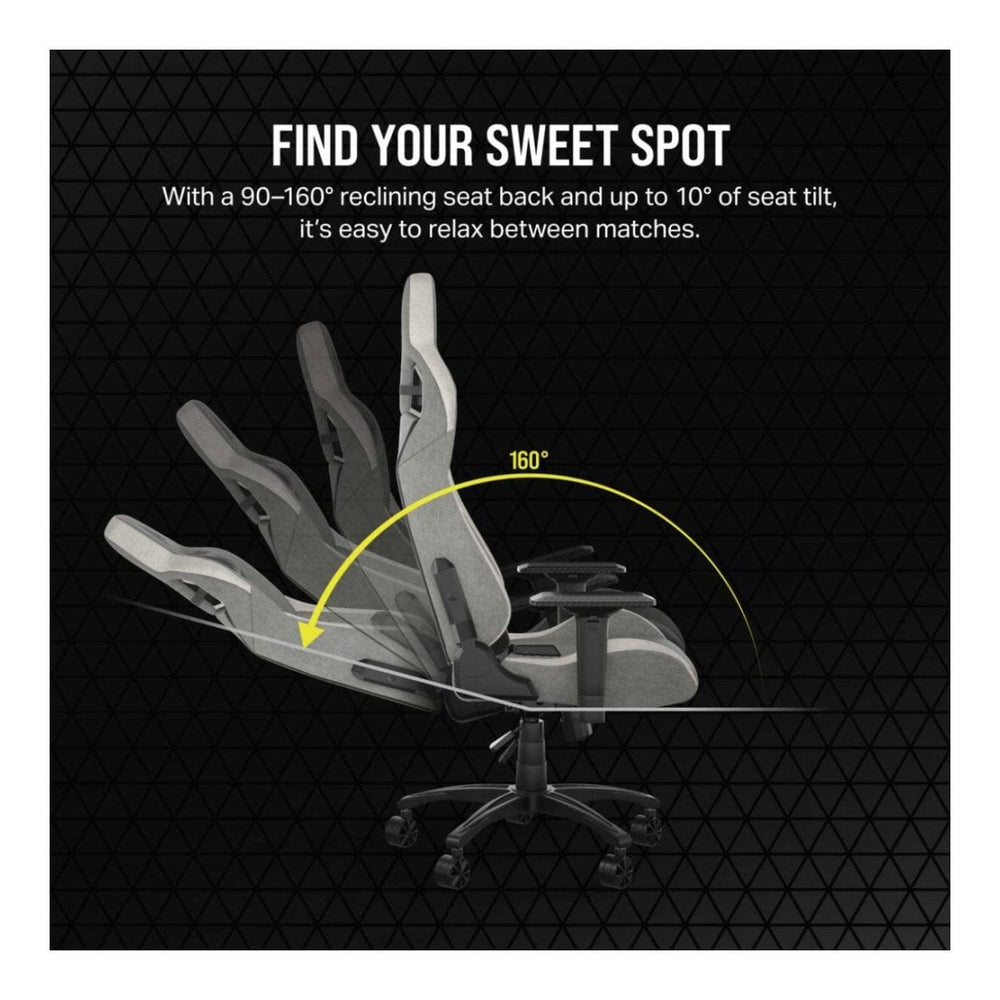 The CORSAIR T3 RUSH gaming chair combines racing-inspired design and contoured comfort, with a breathable soft cloth exterior, padded neck cushion and memory foam lumbar support.