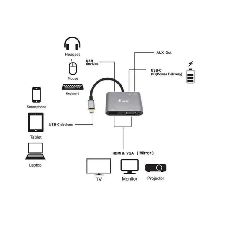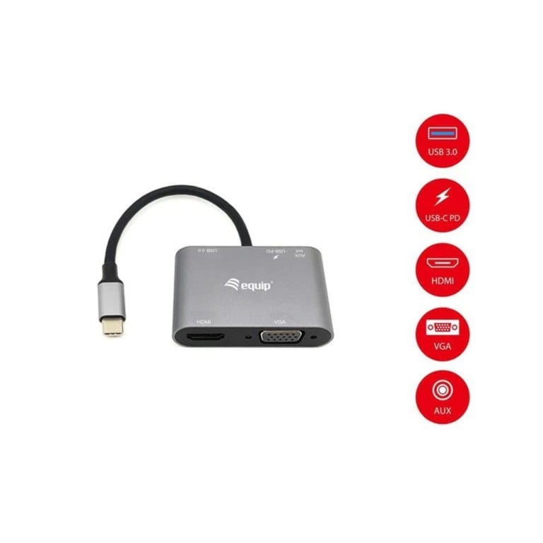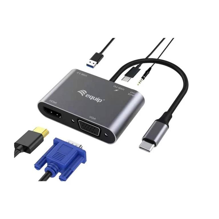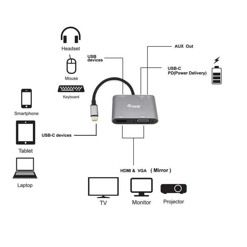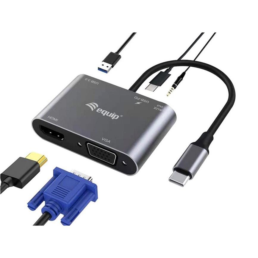 This Equip 133483 5-in-1 USB-C adapter makes it possible to expand your device’s USB-C capacity with HDMI/VGA/USB 3.0/AUX/PD ports. The adapter offers a portable solution for connecting an HDMI and VGA display to your USB-C laptop or desktop computer. The multiport video adapter lets you mirror or extend content on two additional monitors simultaneously (1 x HDMI and 1 x VGA), creating a dual-screen workstation