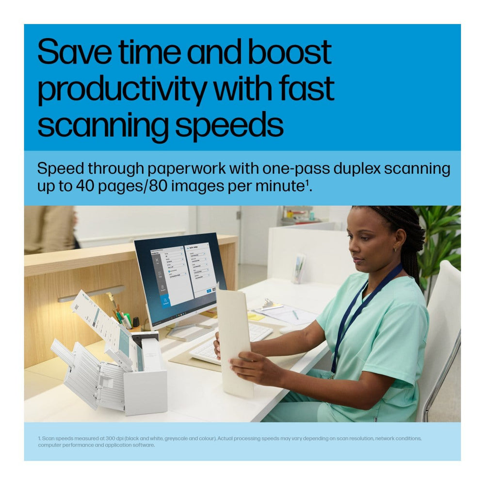 Load your documents for scanning and go about your day with the fast, 50-page Automatic Document Feeder. Get fast scanning with speeds up to 40 pages/ 80 images per minute[1] - recommended for 4,500 pages per day. Save time and reduce waste with two-sided scanning that captures all your data in a single pass. Capture a wide range of documents—even stacks of mixed media sizes and types—with HP EveryPage.