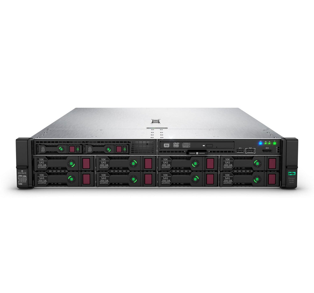 Hewlett Packard Enterprise ProLiant DL380 Gen10. Processor family: Intel Xeon Silver, Processor frequency: 3.2 GHz, Processor model: 4215R. Internal memory: 32 GB, Internal memory type: DDR4-SDRAM, Memory layout (slots x size): 1 x 32 GB. HDD interface: Serial ATA, Serial Attached SCSI (SAS). Ethernet LAN. Power supply: 800 W, Redundant power supply (RPS) support. Chassis type: Rack (2U)