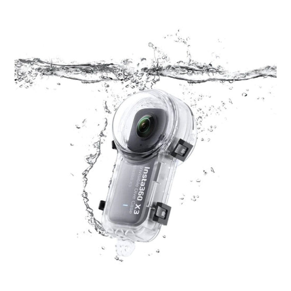 ilm improved diving shots from deep below the surface of the water using this Invisible Dive Case from Insta360. Custom-fit to your X3 camera and designed to compensate for water refractions, the clear case maintains visibility of your touchscreen and controls while ensuring seamless 360° video. It has a waterproof depth rating of IPX8 capable of being submerged up to 164'. A built-in 2-prong mount attaches the case to selfie sticks or mounts of your choice and can be adapted to a 1/4"-20 compatible thread with the included adapter.